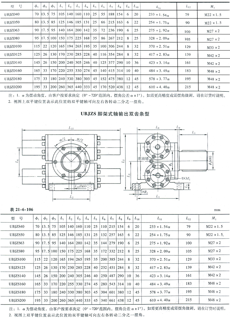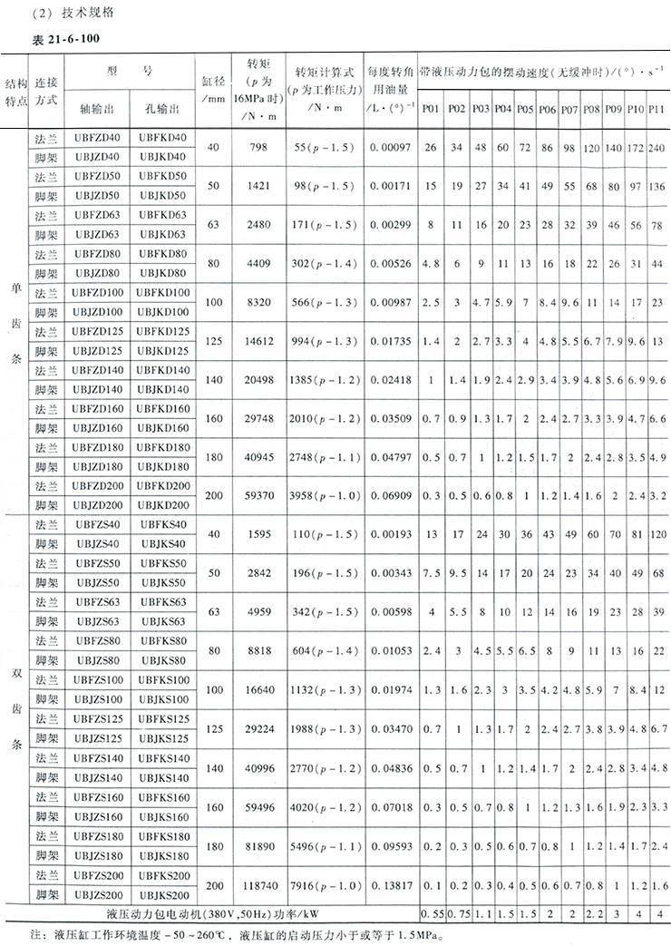 UB型齒輪齒條擺動油缸公稱壓力為16MPa,有單齒條和雙齒條兩種結構型式;有法蘭式和腳架式兩種安裝方式;有軸和孔兩種輸出方式。